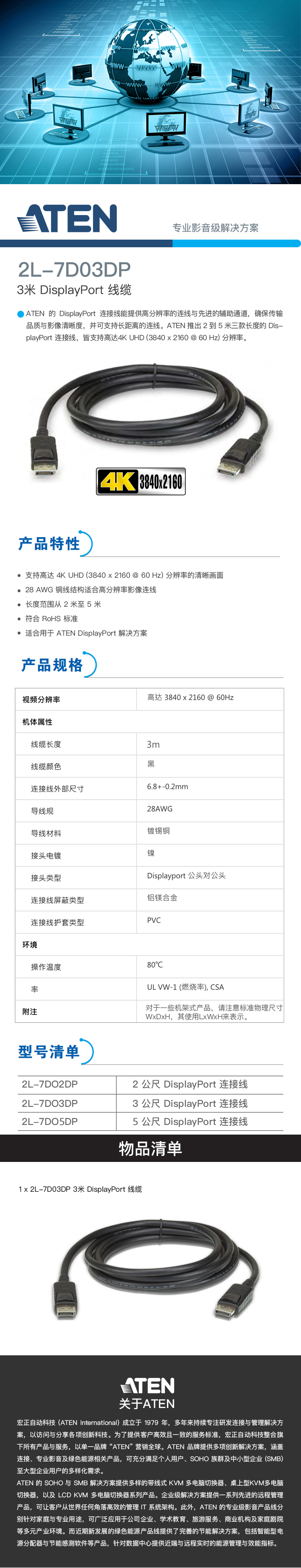 宏正 ATEN 四川成都 2L-7D03DP 3米Display Port 高清連接線材線纜 四川 KVM 總代理