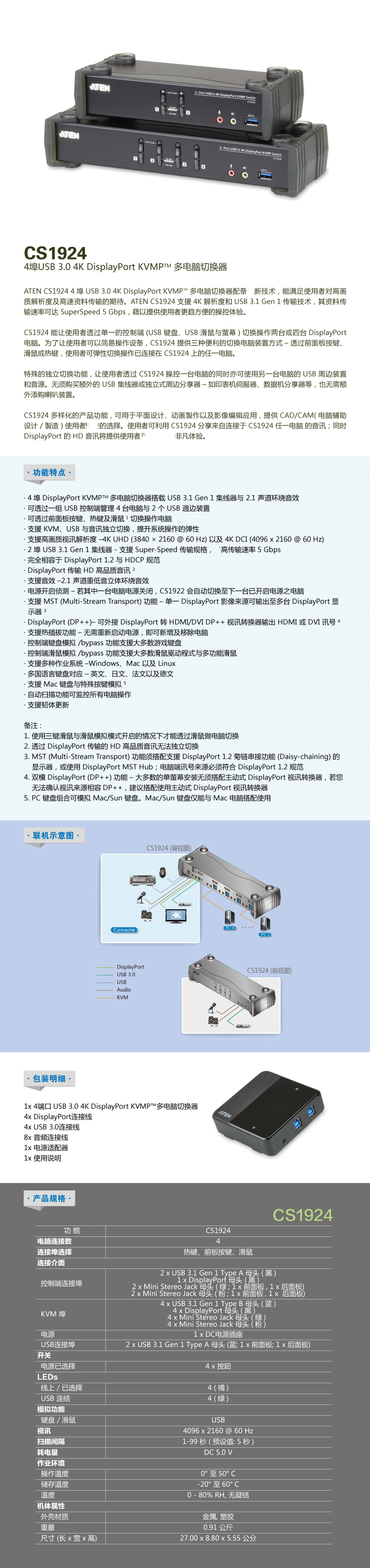 ATEN 宏正 四川總代理 CS1924 4端口 USB3.0 DisplayPort KVMP多電腦切換器 CS1924-AT-Z