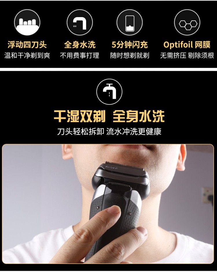 干濕雙重剃驗,掌握鬢角造型,刀頭鎖,全身水洗
