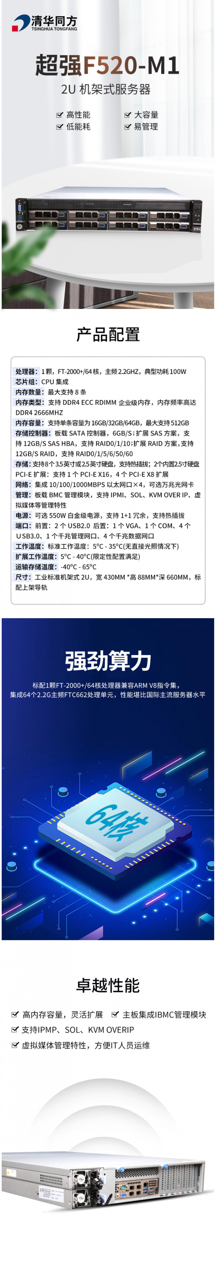 清華同方 四川代理F520-M1機(jī)架式服務(wù)器 FT-2000+ 64核2.2GHz)32G/240G+2T HDD/550W*2/2U支持 1+1 冗余