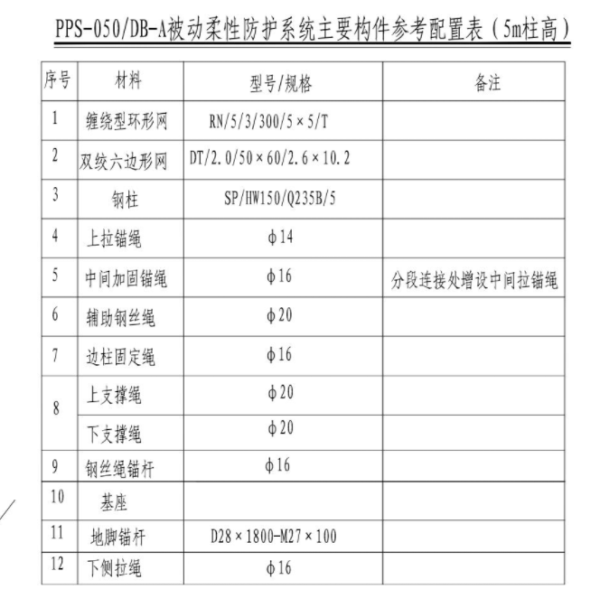 6、被動防護網(wǎng)系統(tǒng)的設(shè)置位置、鋼柱高度、注漿材料等級要求、基礎(chǔ)型式等應(yīng)詳見具體工點設(shè)計圖。