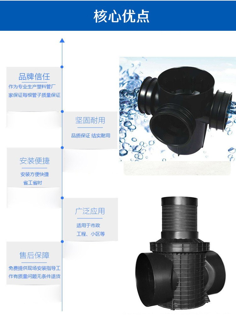 檢查井是用在建筑小區(qū)(居住區(qū)、公共建筑區(qū)、廠區(qū)等)范圍內(nèi)埋地塑料排水管道外徑不大于800mm、埋設(shè)深度不大于6m,一般設(shè)在排水管道交匯處、轉(zhuǎn)彎處、管徑或坡度改變處、跌水處等,為了便于定期檢查、清潔和疏通或下井操作檢查用的塑料一體注塑而成或者磚砌成的井狀構(gòu)筑物。