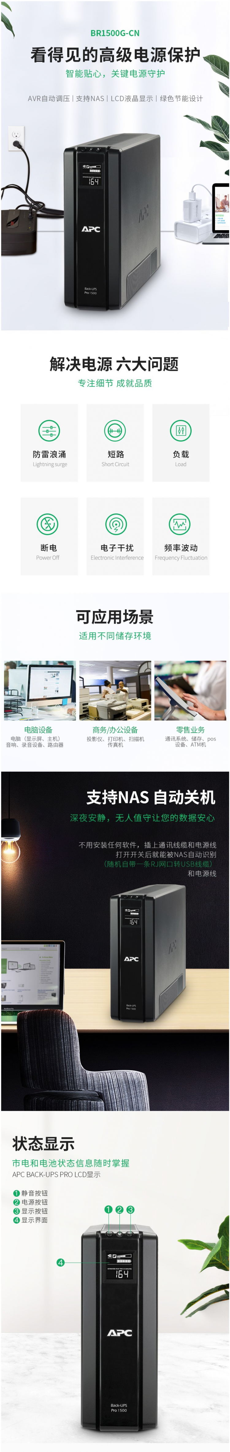 APC 分銷服務(wù)商 BR1500G-CN UPS不間斷電源 865W/1500VA 液晶顯示 USB通訊 2年全國(guó)聯(lián)保