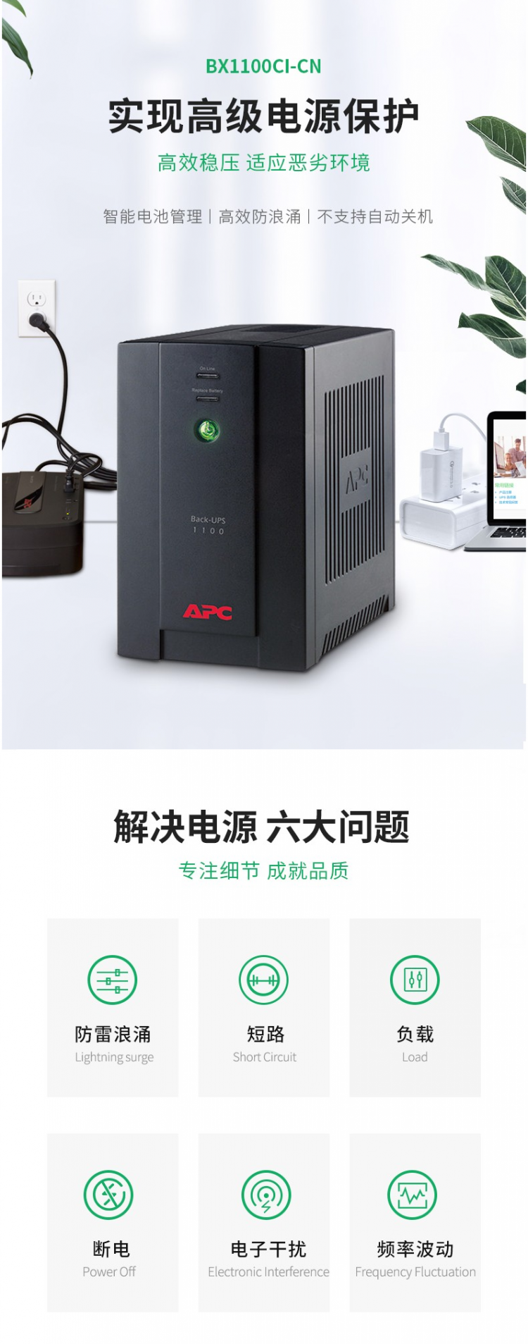 APC 分銷服務(wù)商 UPS BX1100CI-CN UPS不間斷電源 660W/1100VA 防浪涌 穩(wěn)壓 2年全國聯(lián)保