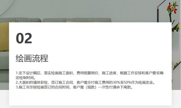 定下設(shè)計(jì)稿后,落實(shí)繪畫施工面積、費(fèi)用預(yù)算報(bào)價(jià)、施工進(jìn)度,根據(jù)工作安排和客戶要求確定繪制時(shí)間。 價(jià)格:商品的展示標(biāo)價(jià),具體的成交價(jià)格可能因商品參加活動(dòng)等情況發(fā)生變化,也可能隨著購(gòu)買數(shù)量不同或所選規(guī)格不同而發(fā)生變化,如用戶與商家線下達(dá)成協(xié)議,以線下協(xié)議的結(jié)算價(jià)格為準(zhǔn),如用戶線上完成購(gòu)買,則*終以訂單結(jié)算頁(yè)價(jià)格為準(zhǔn)。