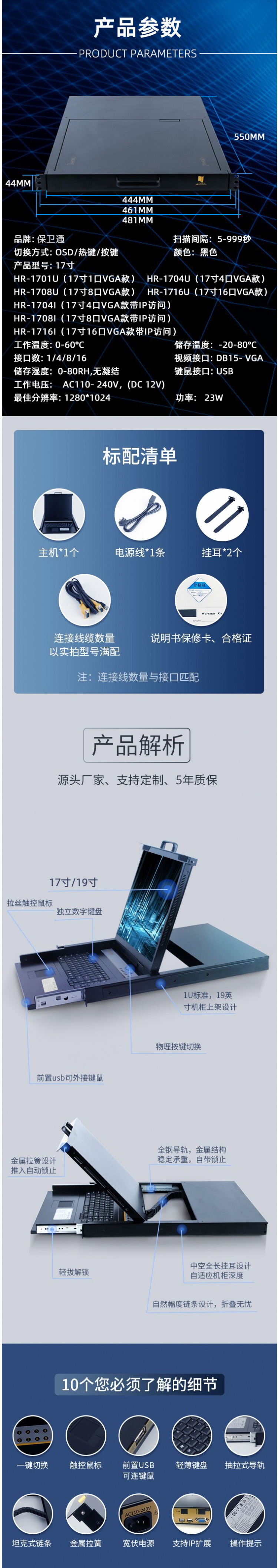 保衛(wèi)通 四川 成都 分銷服務(wù)商 kvm切換器機(jī)架式顯示器 17英寸 高清LED真彩屏數(shù)字IP遠(yuǎn)程訪問 HR-1701U (17寸1口VGA)