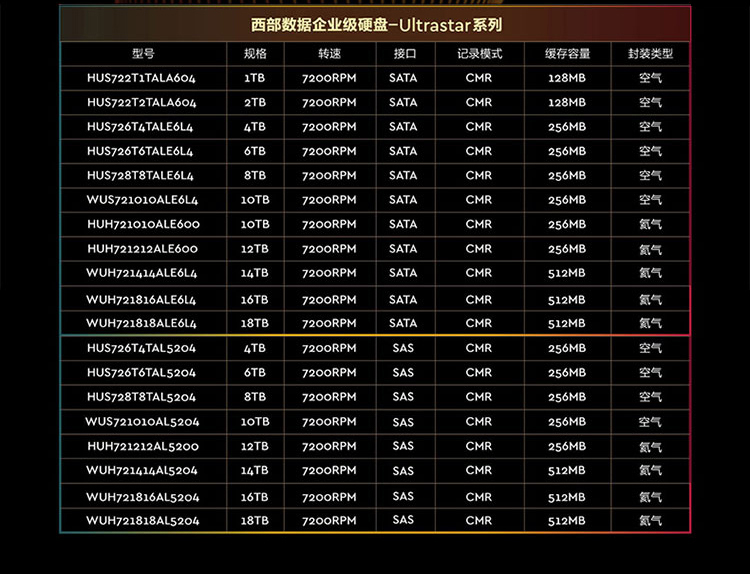 型號:WUH721818ALE6L4 容量:18TB 轉(zhuǎn)速:7200RPM 接口:SATA 記錄模式:CMR 緩存容量:512MB