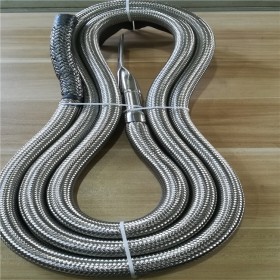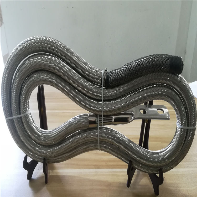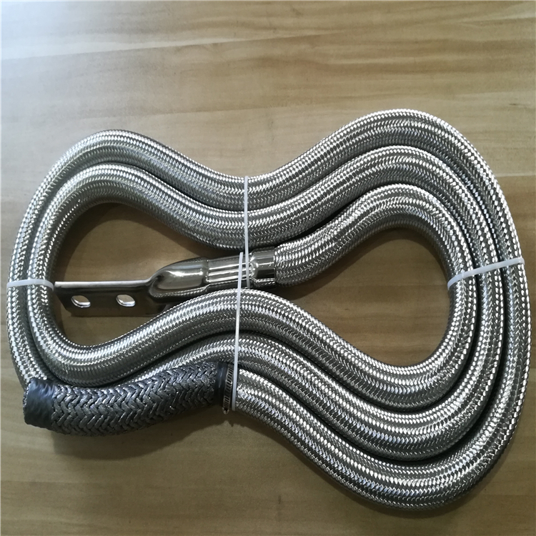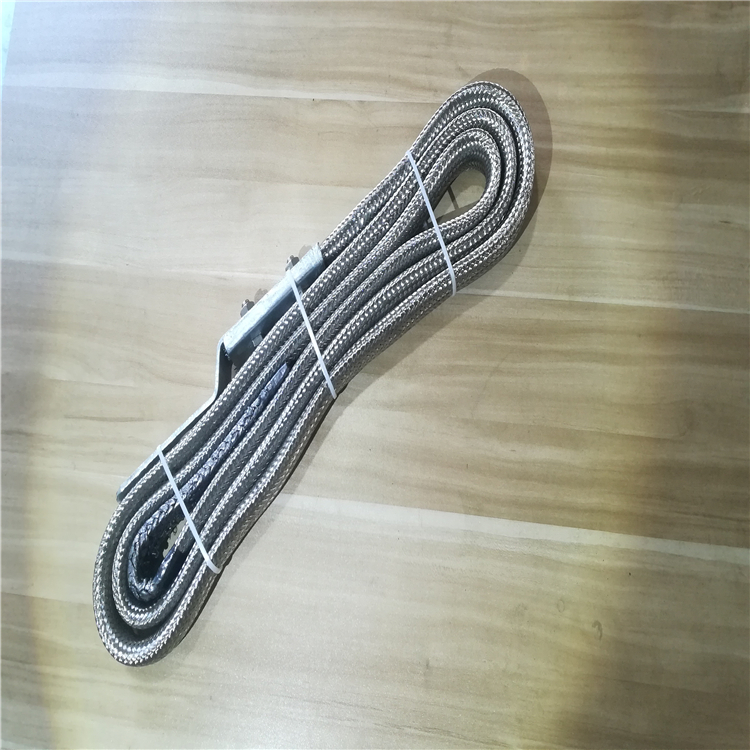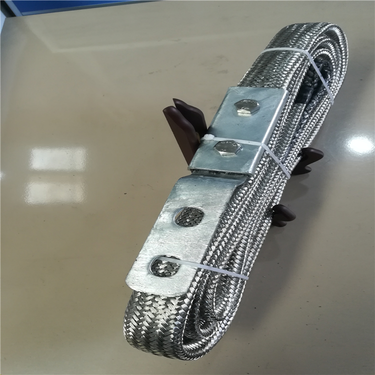 鎧裝式柔性石墨接地引下線內(nèi)部構(gòu)造,帶狀,連接頭連接牢靠,可彎曲性好,折彎后可定型,連接頭宜采用螺栓鎖緊式工藝和304不銹鋼材質(zhì)。石墨層內(nèi)部需為厚度為1.25mm的鏤空狀304不銹鋼帶,石墨層外部為不銹鋼絲編織層,不銹鋼絲外部為帶有警示作用的黑黃相間的熱縮管。規(guī)格型號應(yīng)和配套的石墨基柔性接地體相同。