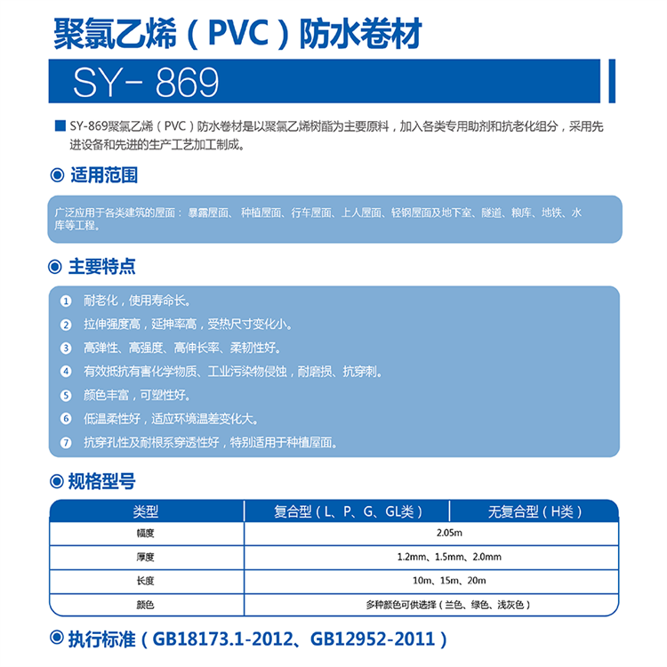 SY-869聚氯乙烯(PVC)防水卷材是以聚氯乙烯樹酯為主要原料,加入各類專用助劑和抗老化組份,采用先進(jìn)設(shè)備和先進(jìn)的生產(chǎn)工藝加工制成。