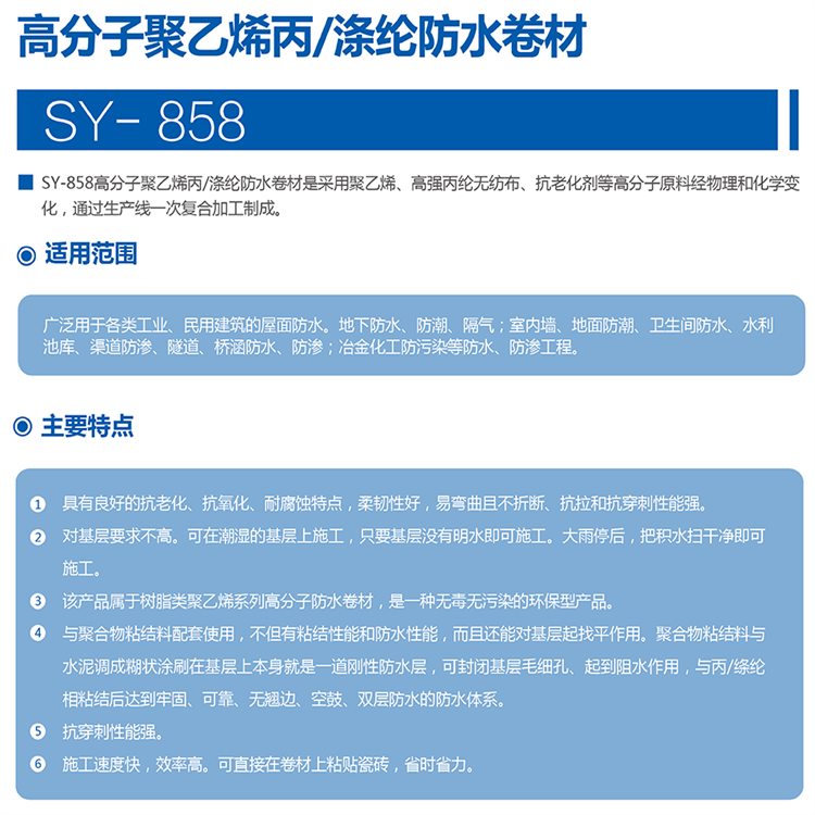 SY-858高分子聚乙烯丙/滌綸防水卷材是采用聚乙烯、高強(qiáng)丙綸無(wú)紡布、抗老化劑等高分子原料經(jīng)物理和化學(xué)變化,通過(guò)生產(chǎn)線一次復(fù)合加工制成。