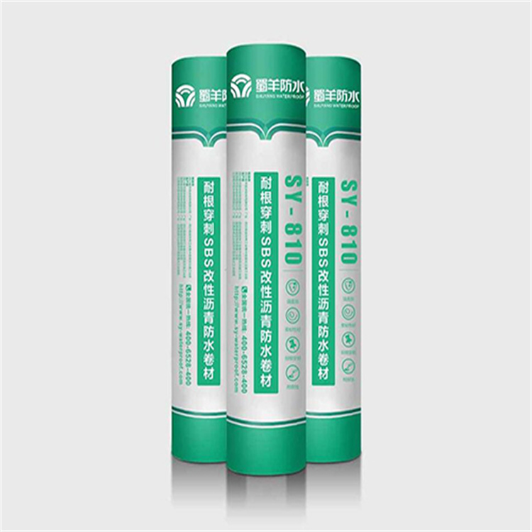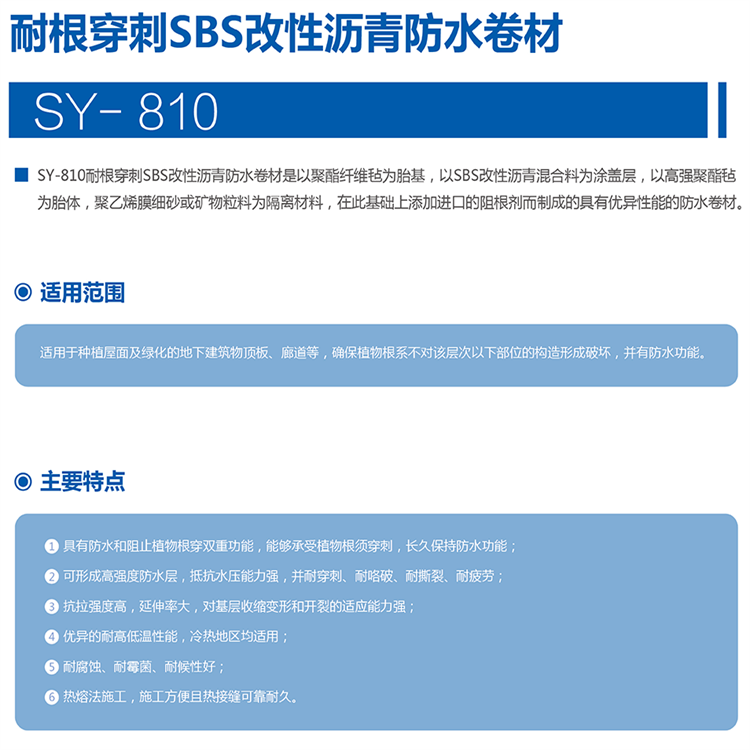 SY-810耐根穿刺SBS改性瀝青防水卷材是以聚酯纖維氈為胎基,以SBS改性瀝青混合料為涂蓋層,以高強聚酯氈為胎體,以聚乙烯膜細沙或礦物粒料為隔離材料,在此基礎上添加進口的組根劑而制成的具有異性能的防水卷材。