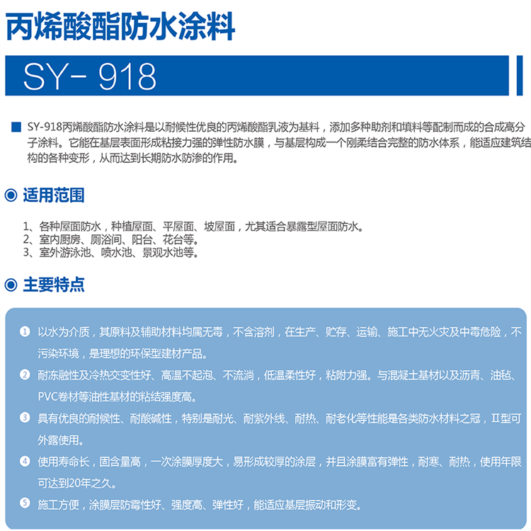 SY-918丙烯酸酯防水涂料是以耐候性優(yōu)良的丙烯酸酯乳液為基料,添加多種助劑和填料等配制而成的合成高分子涂料。它能在基層表面形成粘接力強(qiáng)的彈性防水膜,與基層構(gòu)成一個(gè)剛?cè)峤Y(jié)合完整的防水體系,能適應(yīng)建筑統(tǒng)構(gòu)的各種變形,從而達(dá)到長(zhǎng)期防水防滲的作用。