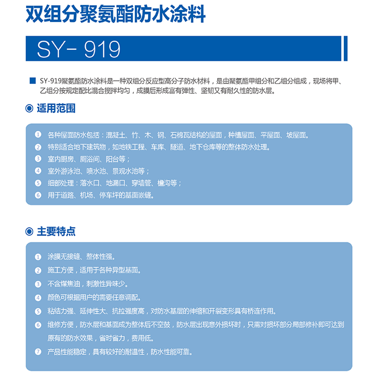 SY-919聚氨酯防水涂料是一種雙組分反應(yīng)型高分子防水材料,是由聚氨酯甲組分和乙組分組成,現(xiàn)場將甲乙組分按規(guī)定配比混合攪拌均勻,成膜后形成富有彈性、堅韌又有耐久性的防水層。