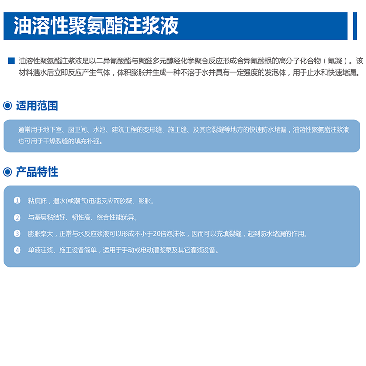 適用范圍:通常用于地下室、廚衛(wèi)間、水池、建筑工程的變形縫、施工縫、及其它裂縫等地方的快速防水堵漏,油溶性聚氨酯注漿液也可用于干燥裂縫的填充補(bǔ)強(qiáng)。