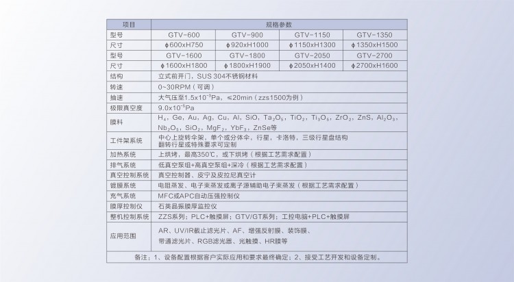 國泰光學(xué)鍍膜設(shè)備專門為精密光學(xué)薄膜器件鍍膜生產(chǎn)而設(shè)計(jì),各系統(tǒng)單元和總體結(jié)構(gòu)很好地滿足了光學(xué)薄膜生產(chǎn)工藝的要求,適 用于AR、UV/IR截止濾光片、AF、增強(qiáng)反射膜、裝飾膜、帶通濾光片、RGB濾光片、ITO膜、HR膜等。 Ø 該系統(tǒng)包括ZZS、GT和GTV系列,腔室尺寸范圍為600?2700mm,可根據(jù)要求提供定制規(guī)格