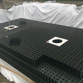 塑料模塊組合的水池安裝方便,承載力大。同時(shí)內(nèi)壁粗糙度為0.009,比混凝土內(nèi)壁光滑,內(nèi)部結(jié)構(gòu)不易附著雜質(zhì),更有利與保證水質(zhì)穩(wěn)定。水池上方可做為綠地,種植花草和樹木等,起到美化環(huán)境的作用。