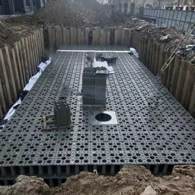 塑料模塊組合的水池安裝方便,承載力大。同時內(nèi)壁粗糙度為0.009,比混凝土內(nèi)壁光滑,內(nèi)部結(jié)構(gòu)不易附著雜質(zhì),更有利與保證水質(zhì)穩(wěn)定。水池上方可做為綠地,種植花草和樹木等,起到美化環(huán)境的作用。
