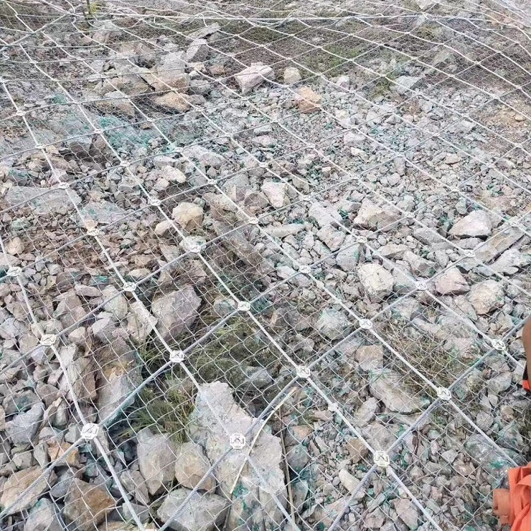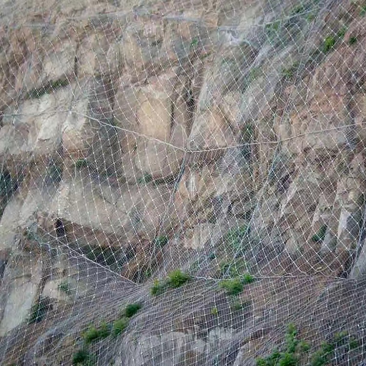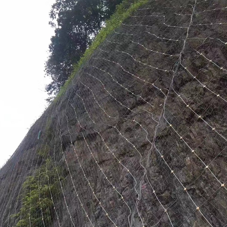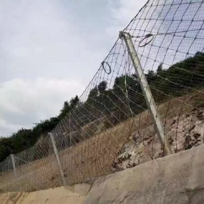 材質(zhì):鋼絲繩網(wǎng)、支撐繩和減壓環(huán)構(gòu)造:由鋼絲繩網(wǎng)或環(huán)形網(wǎng)(需攔截小塊落石時(shí)附加一層鐵絲格柵)、固定系統(tǒng)(錨桿、攔錨繩、基座和支撐繩)、減壓環(huán)和鋼柱四個(gè)主要部分構(gòu)成。