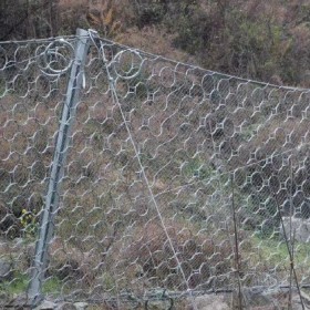 被動防護(hù)是由鋼絲繩網(wǎng)、環(huán)形網(wǎng)、固定系統(tǒng)、減壓環(huán)和鋼柱四個(gè)主要部分構(gòu)成。鋼柱和鋼絲繩網(wǎng)連接組合構(gòu)成