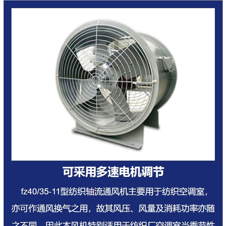 fz40/35-11型紡織軸流通風(fēng)機(jī)主要用干紡織空調(diào)室,亦可作通風(fēng)換氣之用,故其風(fēng)壓、風(fēng)量及消耗功率亦隨之不同。