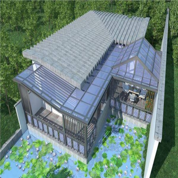 平頂造型的陽光房中規(guī)中矩,一般適用于大型商場,它的優(yōu)點是設計簡單,造價相對便宜