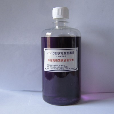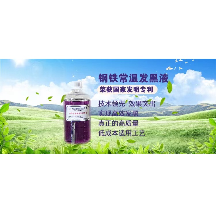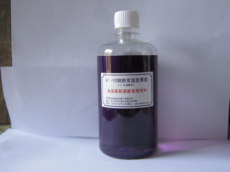 勃生牌KT-10鋼鐵常溫發(fā)黑液是由本公司表面技術專家引進、融合美國技術研制的新一代發(fā)黑產品,于2013年獲得國家發(fā)明專利。產品外觀為淡紫色液體,比傳統(tǒng)的藍色常溫發(fā)黑液具有明顯技術優(yōu)勢。不僅發(fā)黑膜更加牢固、黑亮、細密,而且采用本公司專利技術大幅減少發(fā)黑沉渣,降低效成分損耗,發(fā)黑效率大幅提高,每公斤產品發(fā)黑面積高達18-22㎡,而傳統(tǒng)的常溫發(fā)黑液由于技術局限,發(fā)黑量僅為3-9㎡。勃生公司突破傳統(tǒng)技術瓶頸,實現(xiàn)高效發(fā)黑,使常溫發(fā)黑真正成為一種高質量,低成本的實用工藝。