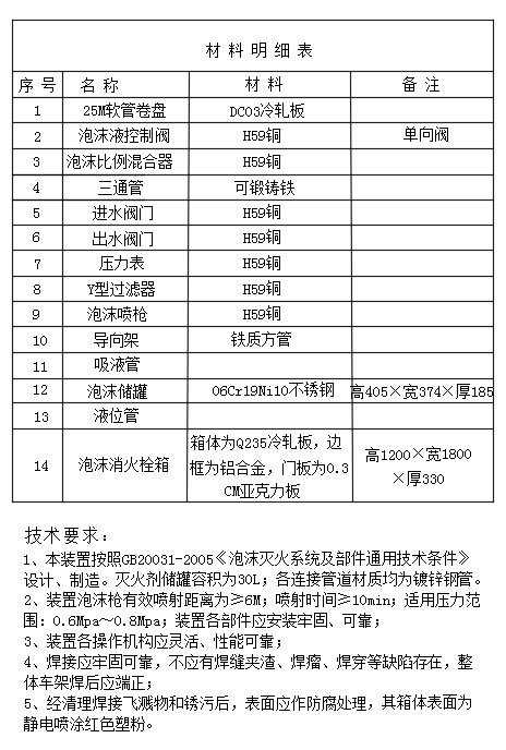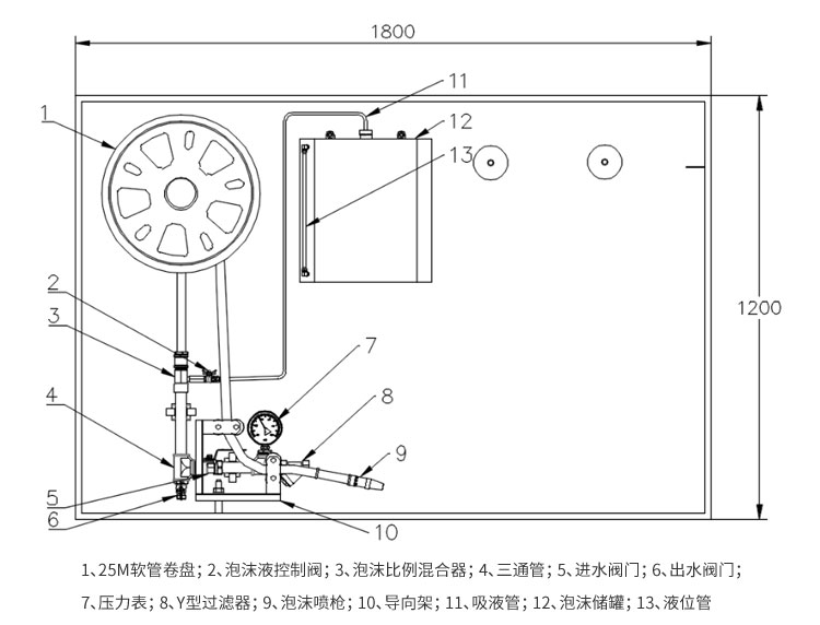1、25M軟管卷盤;2、泡沫液控制閥;3、泡沫比例混合器;4、三通管;5、進(jìn)水閥門;6、出水閥門;7、壓力表;8、Y型過(guò)濾器;9、泡沫噴槍;10、導(dǎo)向架;11、吸液管;12、泡沫儲(chǔ)罐;13、液位管;
