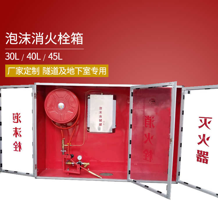隧道泡沫消火栓箱是新型、高效低倍數(shù)泡沫固定滅火裝置。當(dāng)壓力水經(jīng)過(guò)比例混合器時(shí),可使水與泡沫液按規(guī)定比例混合,經(jīng)發(fā)泡槍產(chǎn)生泡沫撲救有機(jī)固體物類、可溶化的固體類火災(zāi),尤其對(duì)撲滅木材、棉花和油類火災(zāi)更有特殊效能。