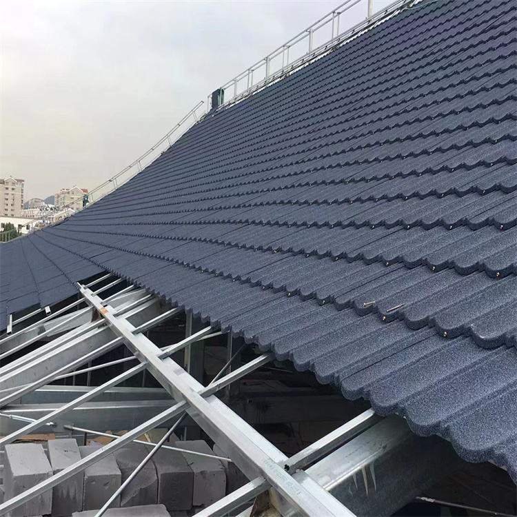 彩石金屬瓦,是采用高新技術(shù)生產(chǎn)的,以防腐性能優(yōu)異的鍍鋁鋅鋼板為基板,以水性丙烯酸酯為粘合劑,以燒結(jié)彩砂為面層,再以耐候性極強的丙烯酸樹脂為外表層(相當(dāng)于油漆)的新型高級屋面材料。因其美觀、輕巧、耐用、環(huán)保,近年來已經(jīng)成為國際屋面材料的主流產(chǎn)品,國內(nèi)高檔建筑使用。