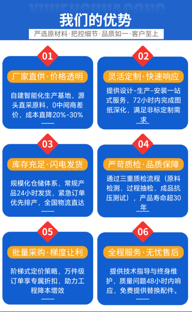 通過(guò)‌三重質(zhì)檢流程‌(原料檢測(cè)、過(guò)程抽檢、成品抗壓測(cè)試),產(chǎn)品壽命超30年;