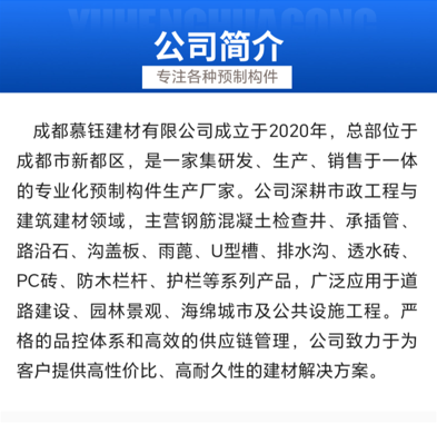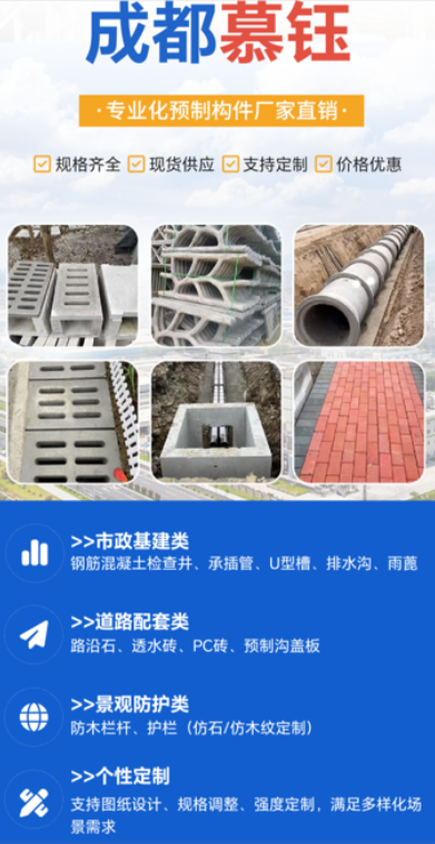成都慕鈺建材有限公司,是一家集研發(fā)、生產(chǎn)、銷售于一體的專業(yè)化預(yù)制構(gòu)件生產(chǎn)廠家。公司深耕市政工程與建筑建材領(lǐng)域,主營(yíng)鋼筋混凝土檢查井、承插管、路沿石、溝蓋板、雨蓖、U型槽、排水溝、透水磚、PC磚、防木欄桿、護(hù)欄等系列產(chǎn)品,廣泛應(yīng)用于道路建設(shè)、園林景觀、海綿城市及公共設(shè)施工程。憑借先進(jìn)的生產(chǎn)設(shè)備、嚴(yán)格的品控體系和高效的供應(yīng)鏈管理,公司致力于為客戶提供高性價(jià)比、高耐久性的建材解決方案。