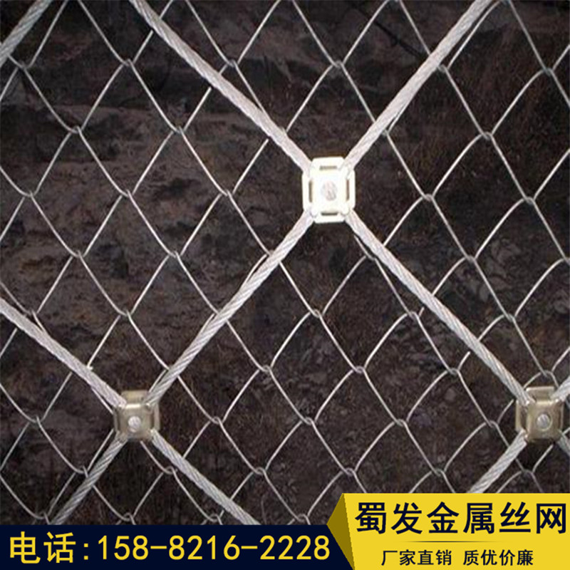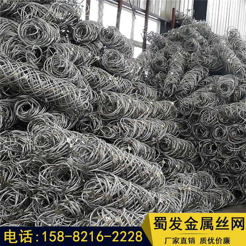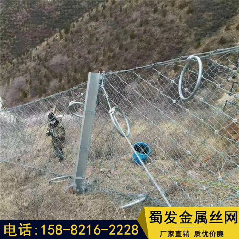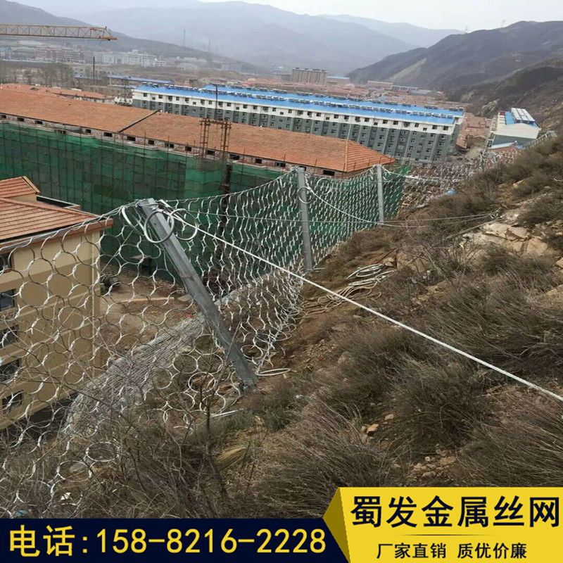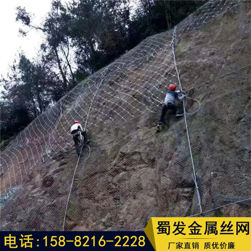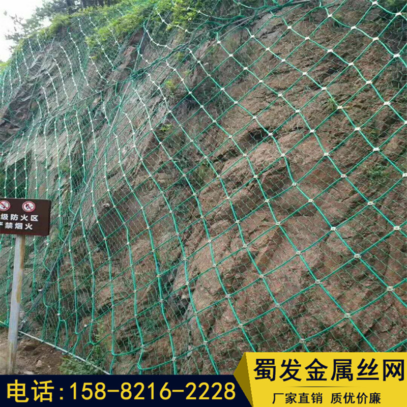 邊坡防護網(wǎng)有主動防護與被動防護,主動防護系統(tǒng)是以鋼絲繩網(wǎng)為主的各類柔性網(wǎng)覆蓋包裹在所需防護斜坡或巖石上,以限制坡面巖石土體的風化剝落或破壞以及為巖崩塌(加固作用),或?qū)⒙涫刂朴谝欢ǚ秶鷥?nèi)運動(圍護作用)。被動防護是由鋼絲繩網(wǎng)、環(huán)形網(wǎng)、(需攔截小塊落石時附加一層鐵絲格柵)、固定系統(tǒng)(錨桿、拉錨繩、基座和支撐繩)減壓環(huán)和鋼柱四個主要部分構(gòu)成。鋼柱和鋼絲繩網(wǎng)連接組合構(gòu)成一個整體,對所防護的區(qū)域形成面防護,從而阻止崩塌巖石土體的下墜,起到邊坡防護作用