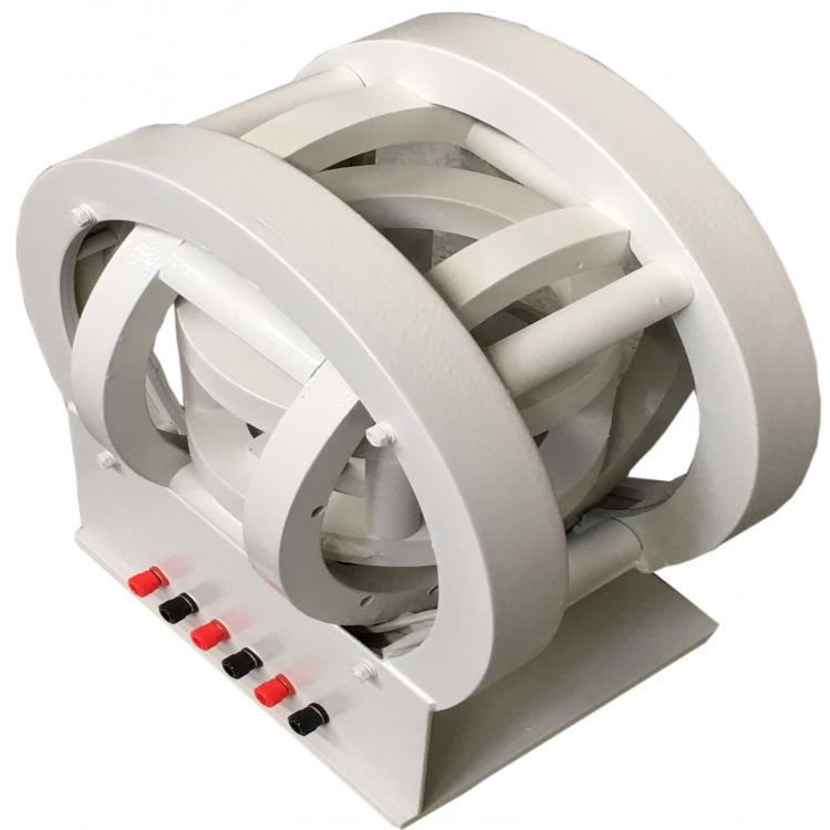 三維線圈,磁場方向X軸、Y軸、Z軸相互正交,每軸上限高磁場強度30Gs(磁場大小可定制),平均直徑300mm,均勻區(qū)球體Φ40mm,均勻度0.1%,電源功率每軸120W。