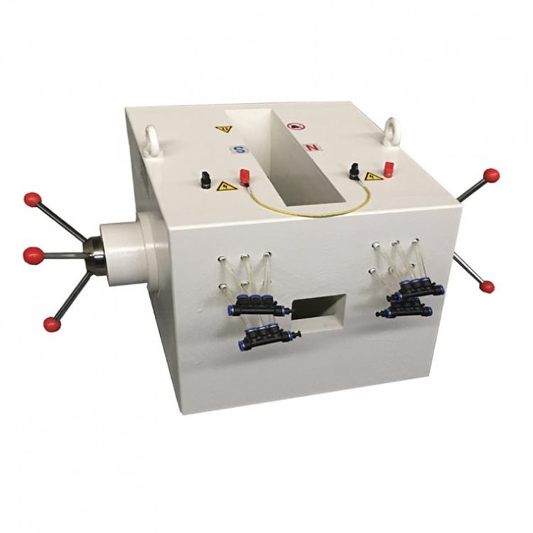 1、PEM-1005ST電磁鐵磁場發(fā)生器在雙軛水冷式H形結(jié)構(gòu)的基礎(chǔ)上改進的結(jié)果,對H型磁軛的上下磁軛增加了爐子或管道的進入通道,前后磁軛增加了觀察窗口。在外冷式電磁鐵的基礎(chǔ)上對冷卻系統(tǒng)進行改造,原來是銅管冷卻,改成水箱冷卻,冷卻效果提高200%。