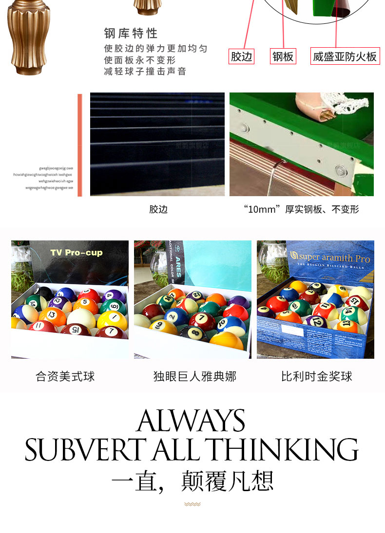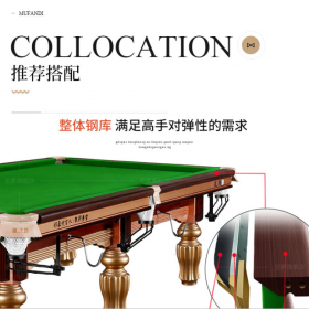 A級青石板,美國進口防火板,實木扶手。尺寸:2.03*3.83*0.85米,配置:臺尼一張,英式球1盒,球桿4支,架桿4支,長打長架,巧粉12粒,手套2個,皮頭10粒,膠水1粒,桿架1個,三角框1個