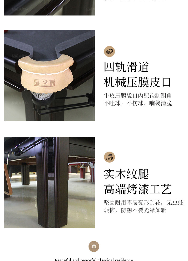 四、鋼口精細(xì)打磨,準(zhǔn)不吐球,高溫模壓皮口,球進(jìn)袋時(shí)有清脆的響袋聲音。
