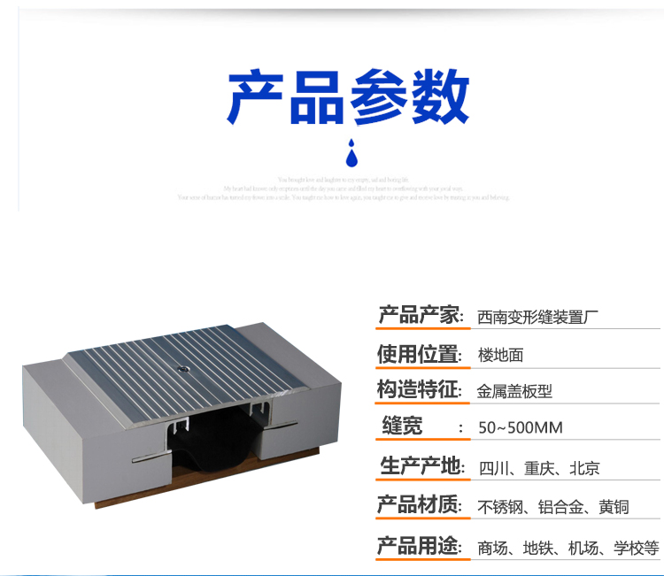 (3)材料分類:建筑金屬蓋板型地面變形縫按照承載要求可分為普通樓地面變形縫(承載量小,一般行人通過)承載型樓地面變形縫(承載能力大,車量及人通過)。根據(jù)構(gòu)造要求,建筑金屬蓋板型樓地面變形縫可分為平面型及轉(zhuǎn)角型兩種。