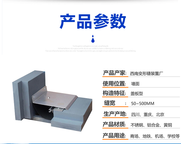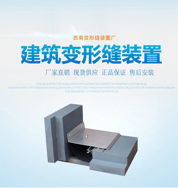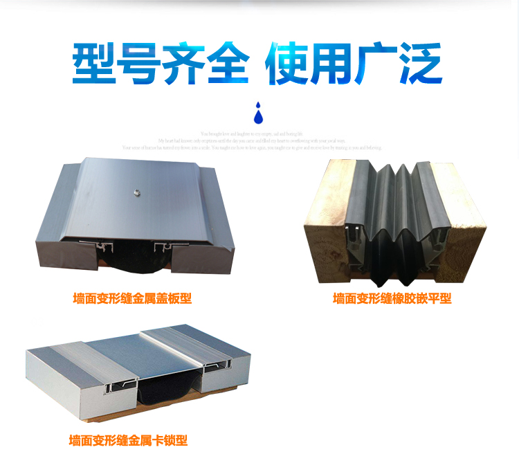 1.金屬蓋板型:由鋁合金基座、鋁合金(或不銹鋼)中心板、不銹鋼滑桿組成。適用縫寬50-450mm。金屬蓋板型的特點(diǎn)是在蓋板與固定于變形縫兩側(cè)的基座之間采用滑桿連接,當(dāng)基座變位時,金屬蓋板始終保持位于縫的中心,當(dāng)用于樓地面是可以增加蓋板厚度,提高承受能力。一般承載型荷載為18.4kN(7.5T叉車通過)。承重型可根據(jù)工程要求而定。