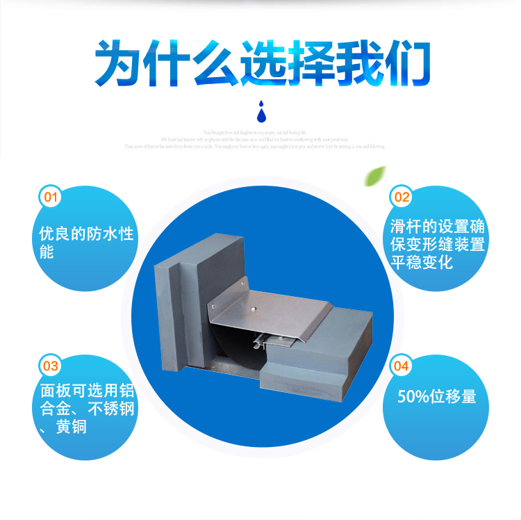 3.雙列嵌平型:由鋁合金基座、鋁合金中心板、不銹鋼滑桿和橡膠條組成,適用縫寬50-450mm。雙列嵌平型中心板分平面型和凹槽型,凹槽型的槽內(nèi)可嵌入石材、地磚、地毯等裝飾材料,設(shè)用與潔凈度較高的樓地面。