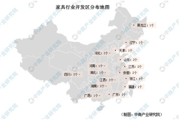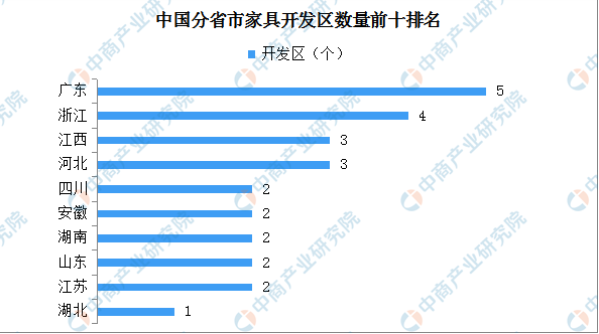 其次為浙江省,擁有家具開發(fā)區(qū)4個(gè);江西省、河北省家具開發(fā)區(qū)各有3個(gè);四川省、安徽省、湖南省、山東省、江蘇省各有2個(gè);其他省市均為1個(gè)。