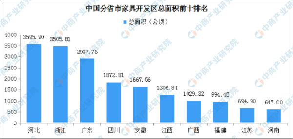 從面積來看,河北、浙江、廣東、四川、安徽、江西、廣西7地的家具開發(fā)區(qū)總面積均在1000公頃以上。