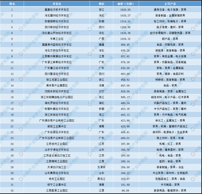 具體來看,位于浙江省的嘉善經(jīng)濟(jì)技術(shù)開發(fā)區(qū)面積最大,達(dá)1820公頃,主導(dǎo)產(chǎn)業(yè)包括通用設(shè)備、電子信息、家具。其次為河北省的河北霸州經(jīng)濟(jì)開發(fā)區(qū)、安徽省的安徽潁泉經(jīng)濟(jì)開發(fā)區(qū)、四川省的四川崇州經(jīng)濟(jì)開發(fā)區(qū)、河北省的河北唐山蘆臺經(jīng)濟(jì)開發(fā)區(qū)。以上開發(fā)區(qū)面積排名全國前五,合計(jì)6903.68公頃。