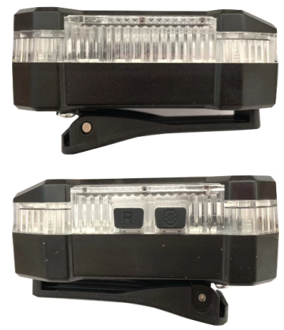 無線報警肩燈共有三個開關按鈕,正面按鈕是電源開關,另一側是兩個按鈕,“R”用于取消報警,另一個是用于切換燈光。