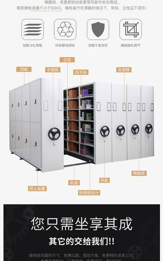 移動密集架主要用于檔案資料、證券憑證等的存放,具保密封閉、空間利用率高、存取方便的優(yōu)點。